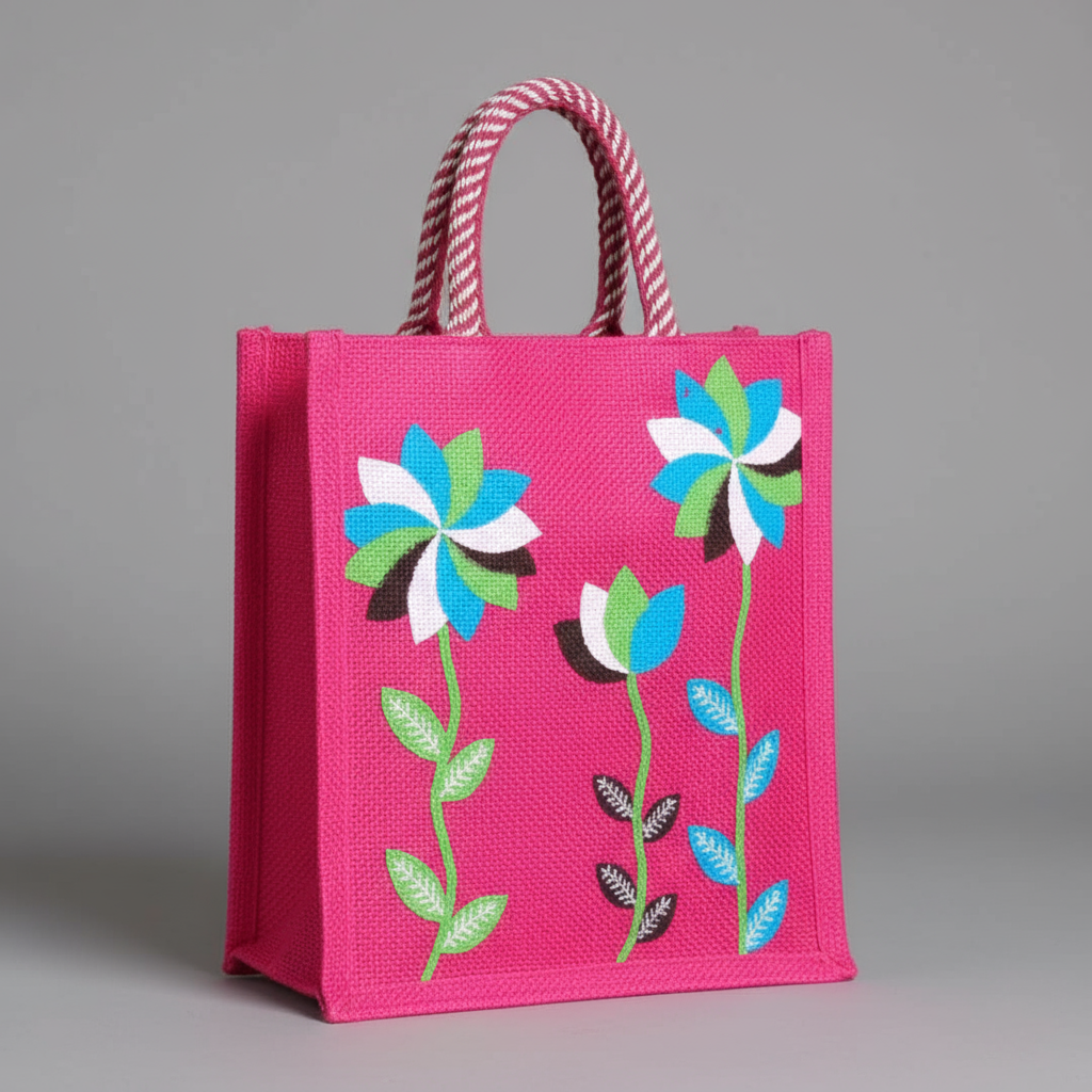 - Stylish multicolor floral print on a vibrant blue jute base Strong laminated jute with reinforced stitching for daily use Zipper closure keeps contents secure and organized Ideal for shopping, gifting, lunch, or casual carry Comfortable padded rope handles for easy carrying